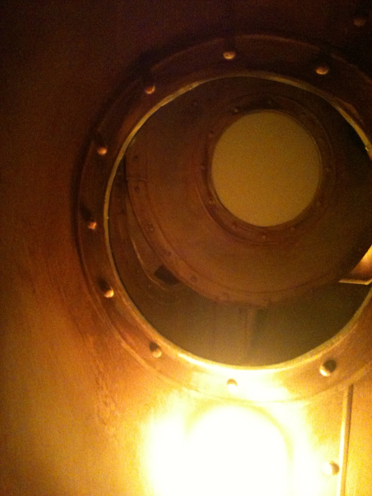 Nonetheless, it sports an armoured submarine bathroom, with bolts and portholes and metal and all! Which doesn't preclude the usual political and anatomical wall messages (here largely overlapping categories): one spots, for instance, the prominent word